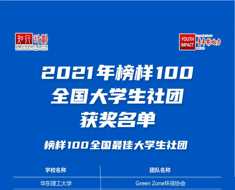 2022年1月,为积极响应“美丽中国 青春行动”号召,鼓励和支持青年大学生成为美丽中国的践行者,由共青团中央发起,2021年知行计划“榜样100”全国最佳大学生社团评选活动落下帷幕,必赢官网GreenZone环保协会(挂靠指导单位:437bwin必赢国际官网)已连续三年被评为“榜样100”全国最佳大学生社团。