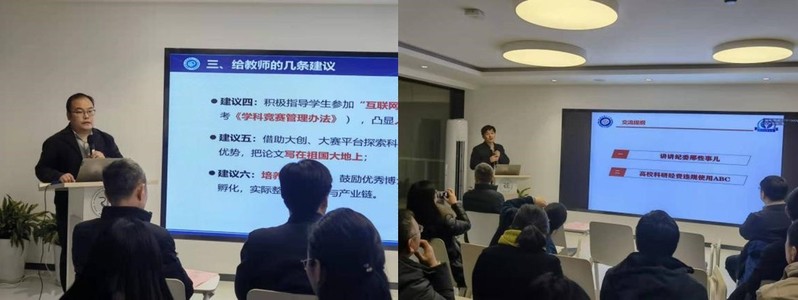 司忠业为学院全体教师做了题为“华理创新创业教育的任务与举措”的报告,从“高校创新创业教育形势与任务”、“华理创新创业教育理念与架构”及“双创教育‘十四五’建设目标与举措”三个方面进行深入解读,帮助教师们更好了解和指导创新创业教育。杨艳生以“遵纪守规守法,做廉洁高校人”为题,介绍了学校纪委的主要工作职责,同时围绕高校科研经费合法合规使用等主题进行了相关案例分析和警示。