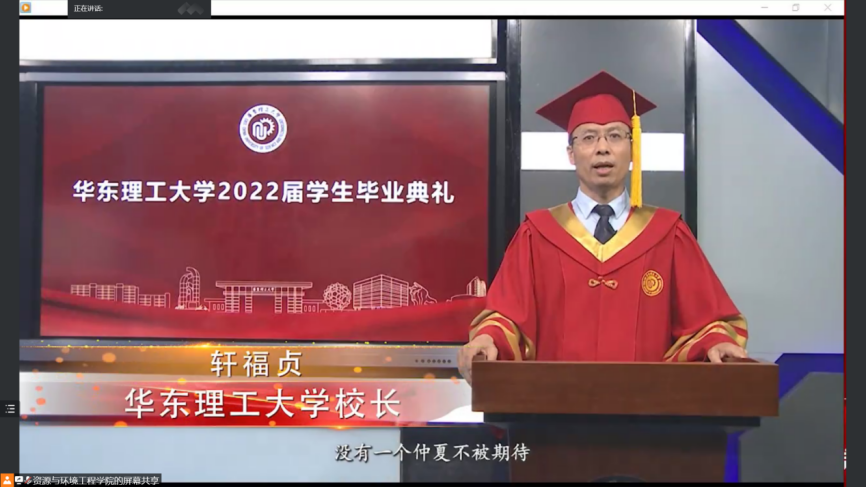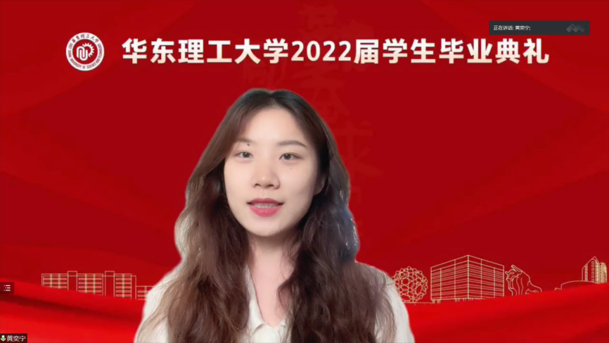 硕士毕业生代表黄奕宁同学表示,作为资环毕业生,应将理论与产业相结合,牢记科技报国之责,学以致用,为国家科技发展做出贡献。她认为这次校园防疫是研究生生涯的最后一课,作为毕业生要坚定理想信念,厚植家国情怀,勇担时代责任,以青春之我,奋斗之我,践行“请党放心,强国有我”的铮铮誓言。