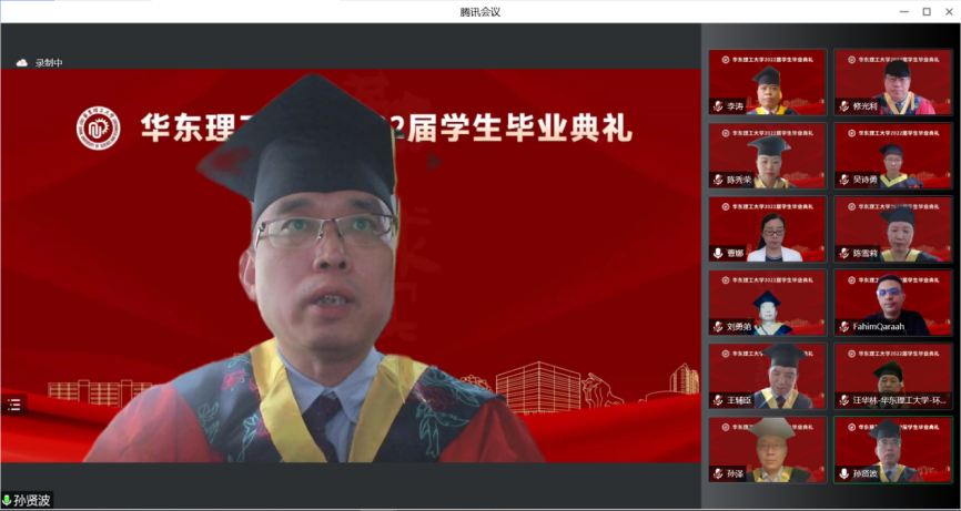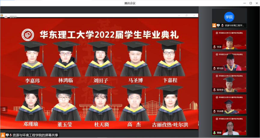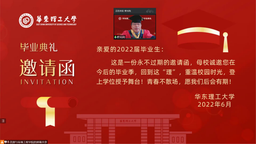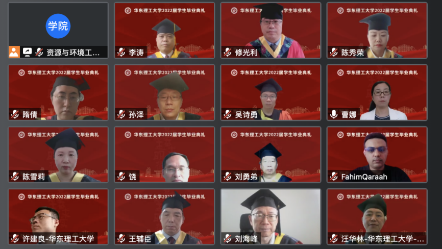 6月23日下午,437bwin必赢国际官网2022届学生毕业典礼在云端隆重举行。校党委常委、副校长李涛,437bwin必赢国际官网党委书记修光利,院长汪华林,党委副书记陈雪莉、饶志雄,副院长孙贤波、孙泽、隋倩,学院工会主席吴诗勇,环境工程专业责任教授刘勇弟、能源与动力工程专业责任教授王辅臣、安全工程专业责任教授刘海峰以及各系系主任、毕业班班导师、研究生导师代表、学院党政办、学生工作办全体教师以及300余名2022届本、研毕业生参加了毕业典礼。典礼由学院党委副书记曹娜主持。