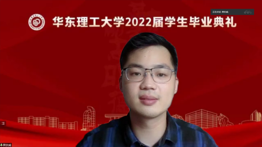 中国大学生自强之星、本科毕业生代表黄钦威同学向大家分享了自己理解的“汗水哲学”:“学”字当头,挥洒勤奋求实的汗水;“干”字领先,挥洒担当作为的汗水;“情”字铺底,挥洒竭诚奉献的汗水。作为学生党员,疫情期间他投身“抗疫赛道”,本科毕业后,他选择成为一名研究生支教团志愿者,将远赴云南寻甸开展为期一年支教活动。