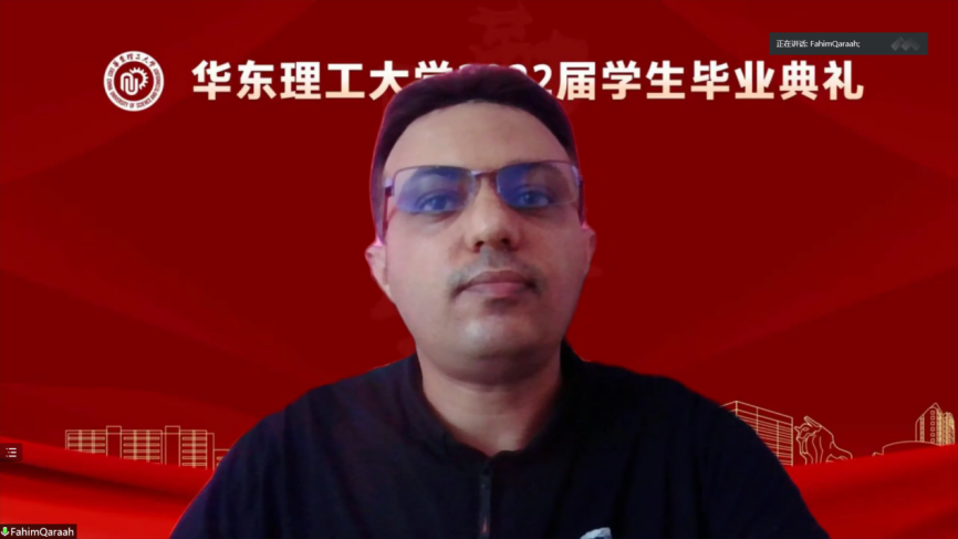 来自也门的博士毕业生代表法穆,荣获了437bwin必赢国际官网优秀国际毕业生称号,他分享了自身的读博经历,向学校、学院教师们致以最诚挚的感谢,并向全体毕业生送上真诚的祝福,并深情地表达了自己对母校,对上海,对中国的热爱。