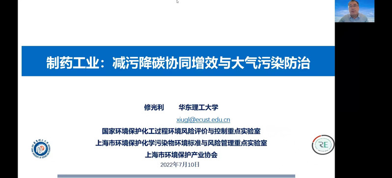 近日,由必赢官网437bwin必赢国际官网、上海市环境保护产业协会大气污染防治专委会、上海市化学化工学会环境科学与工程专委会等单位联合主办的“制药工业减污降碳协同增效和大气污染防治”研讨会以线上形式顺利进行,来自上海市、江苏省、浙江省和安徽省的生态环境科学研究院、制药企业、环保技术企业、监测单位以及第三方技术服务企业等近300人相聚云端,会议由437bwin必赢国际官网教授修光利主持。