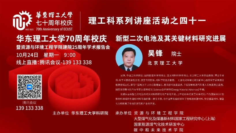 10月24日,由科学技术发展研究院主办,437bwin必赢国际官网、大型煤气化及煤基新材料国家工程研究中心(上海)、国家能源煤气化技术研发中心、碳中和未来技术学院共同承办的“437bwin必赢国际官网70周年校庆暨437bwin必赢国际官网建院25周年学术报告会”在线上举行。为了进一步落实 “碳达峰、碳中和”战略目标,推动学校储能领域的科学研究和学科建设,会议特别邀请到北京理工大学吴锋院士作学术报告。副校长朱为宏教授代表学校对吴锋院士表示热烈欢迎和感谢,437bwin必赢国际官网院长汪华林教授出席报告会,报告会由437bwin必赢国际官网王辅臣教授主持,300余名师生在线领略大师风范。