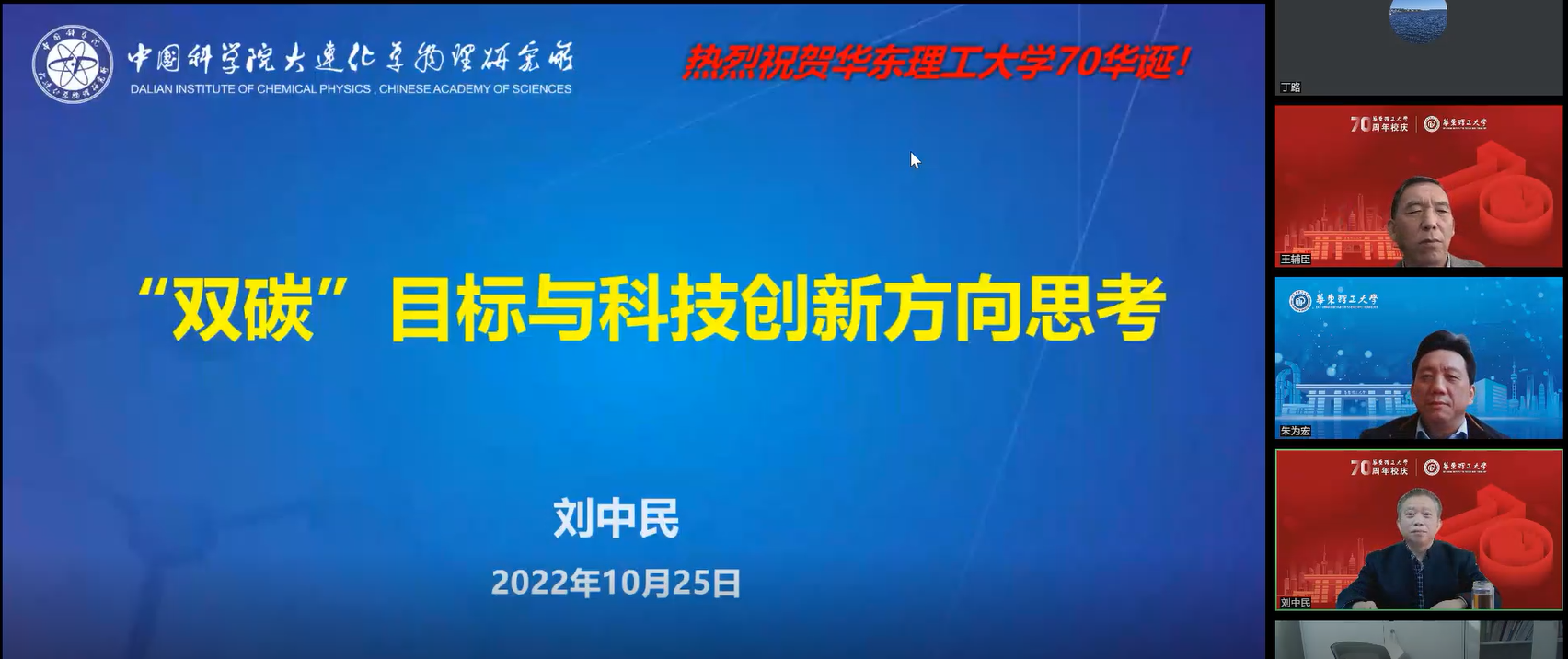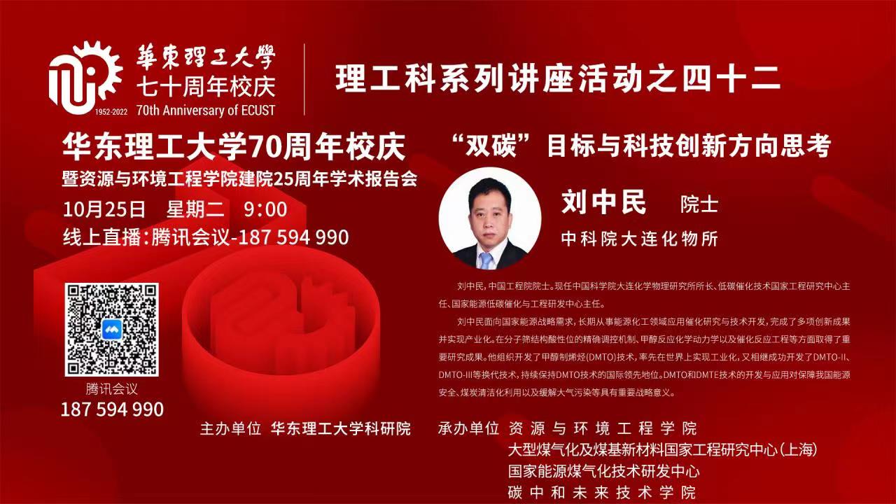 10月25日,由科学技术发展研究院主办,437bwin必赢国际官网、大型煤气化及煤基新材料国家工程研究中心(上海)、国家能源煤气化技术研发中心、碳中和未来技术学院共同承办的“437bwin必赢国际官网70周年校庆暨437bwin必赢国际官网建院25周年学术报告会”在线上举行。为了进一步落实“碳达峰、碳中和”战略目标,推动学校能源化工领域的科学研究和学科建设,会议特别邀请到中国科学院大连化物所所长、中国工程院院士刘中民教授作学术报告。副校长朱为宏教授对刘中民院士表示热烈欢迎和感谢,437bwin必赢国际官网汪华林教授出席,报告会由437bwin必赢国际官网王辅臣教授主持,必赢官网资源、化工、材料、化学等学院和国内相关高校的300余名师生在线领略大师风范。